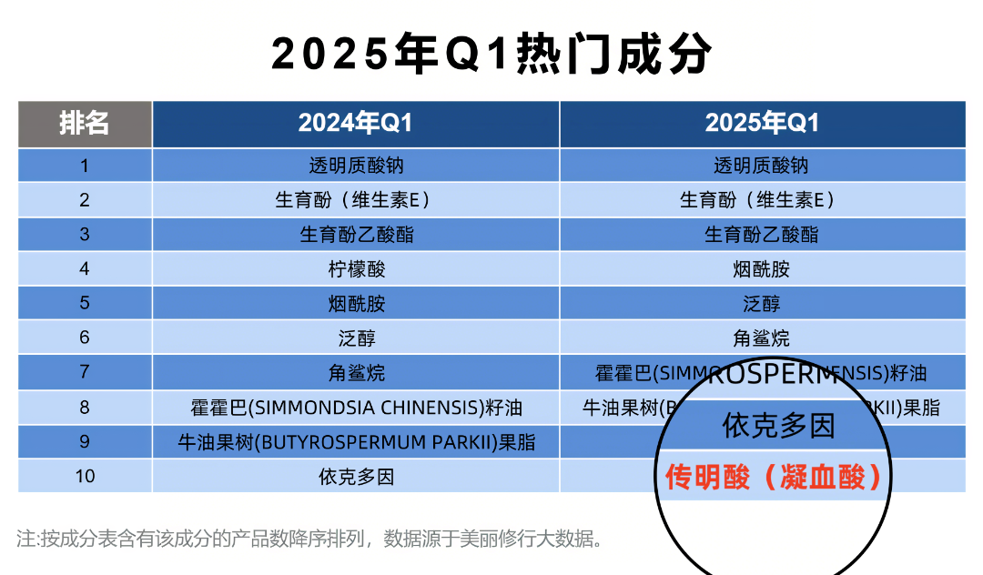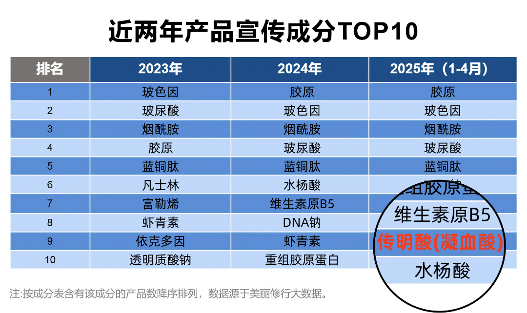 当烟酰胺、维生素C等经典美白成分逐渐步入市场成熟期,一个曾被低估的“医用级美白成分”正强势突围,它就是传明酸。据美丽修行大数据,2025年Q1热门成分榜单中,传明酸已挤进前10;在2025年1-4月产品宣称成分榜单中,更是首度入榜就冲到第9,挤掉富勒烯、超过水杨酸,成为珀莱雅、OLAY、敷尔佳等头部护肤品牌争相押注的新宠。