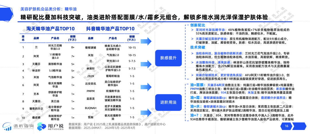 2025年1月1日至6月23日期间,精华油品类声量同比增达104%,且其养肤抗皱功效类型声量占比扩张超3%,且仍有上涨趋势。