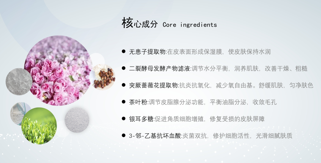 融合无患子、二裂酵母、突厥蔷薇花、茶叶粉、银耳多糖、3-邻-乙基抗坏血酸等多重精粹,协同作用,清洁同时修润强韧肌肤。