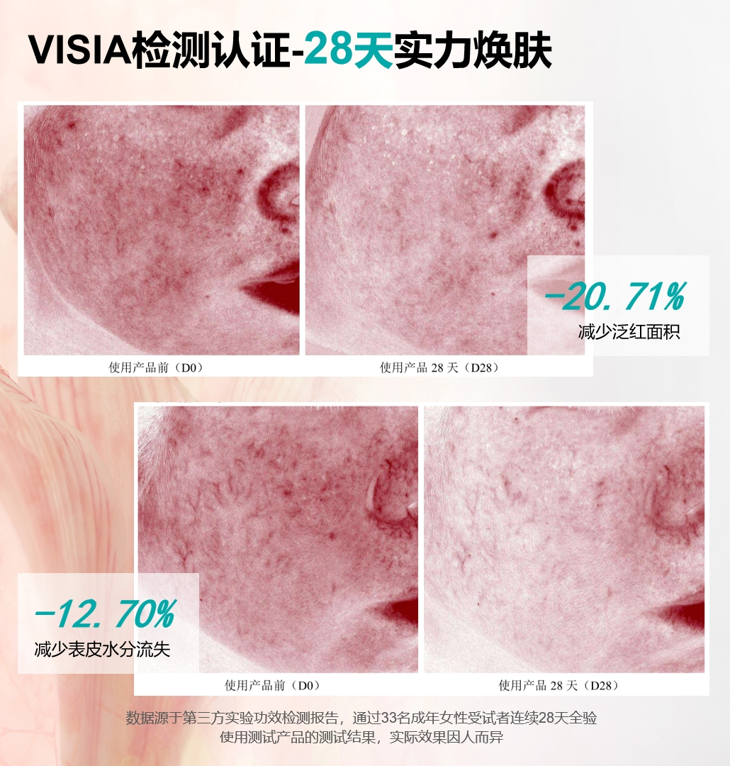 通过权威的科学实验检测,受试者在使用产品28天后,能降低面部皮肤水分散失率,缓解面部泛红,减少面部泛红面积,达到保湿、修护、舒缓的作用。