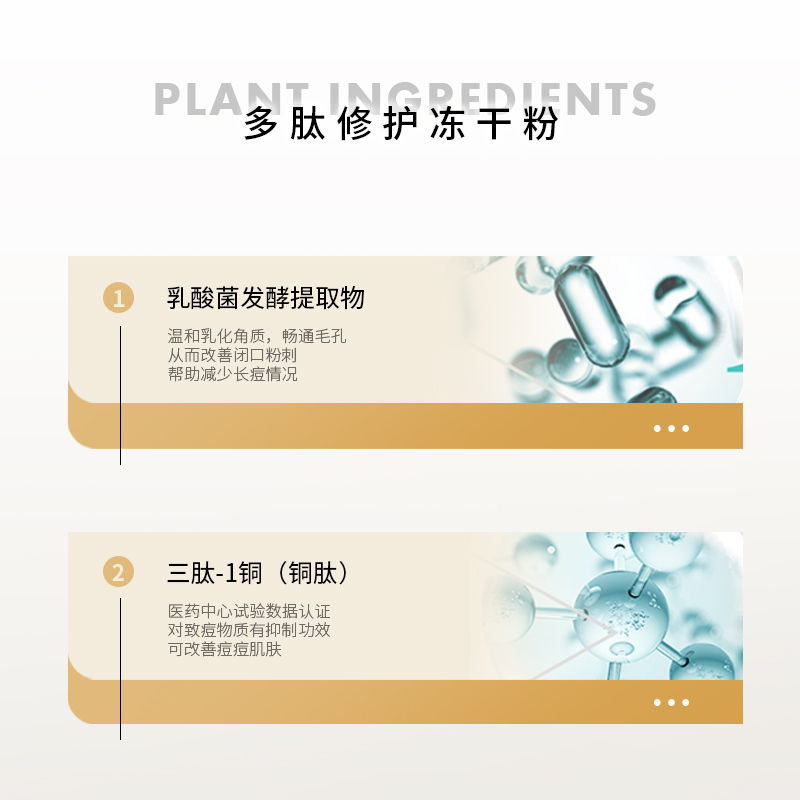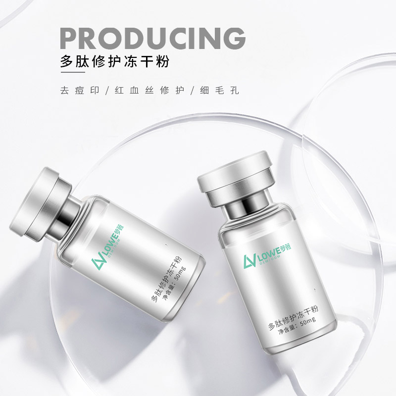 不添加色素等添加剂,富含寡肽-1为核心成分,成分稳定,活性修复力超强,可根据抗衰、抗氧、美白、防蓝光、抗敏、修复等不同功效诉求,研发出多个系列的冻干粉功能,最大限度保存物质的活性,促进表皮细胞的修复和生长作用,适用于所有肤质。