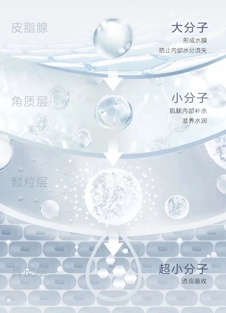 在保湿之前,首先得让肌肤水分充足,护肤品中的分子量大小,决定了其能否真正渗透肌肤。分子量小于500的分子称之为小分子,它具有优异的肌肤渗透性和细胞穿透性,不需人体分解,即可直接吸收,能大大提升营养成分吸收效率。