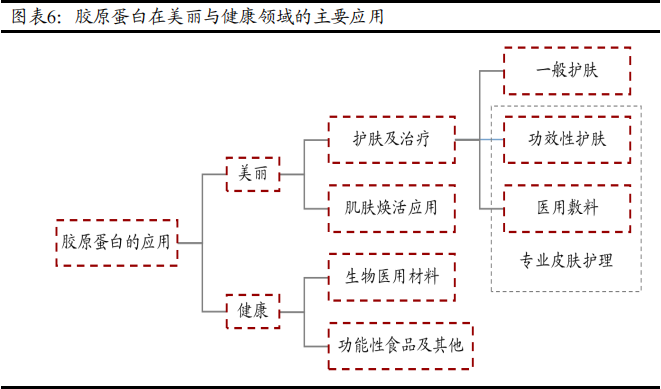从应用上来看,重组胶原蛋白主要应用于功效性护肤品、医用敷料、肌肤焕活及生物医用材料四个领域,其中重点为功效性护肤品和医用敷料市场。
