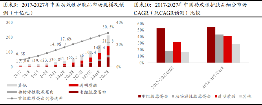 其中重组胶原蛋白市场规模108亿元,占比38%,CAGR约63%。