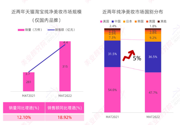 根据美业颜究院数据报告(《2022CleanBeauty中国市场趋势风向》)显示,中国纯净美妆市场份额近两年上升5%,超过美、英、日、韩、等国家,本土发展前景一片广阔。