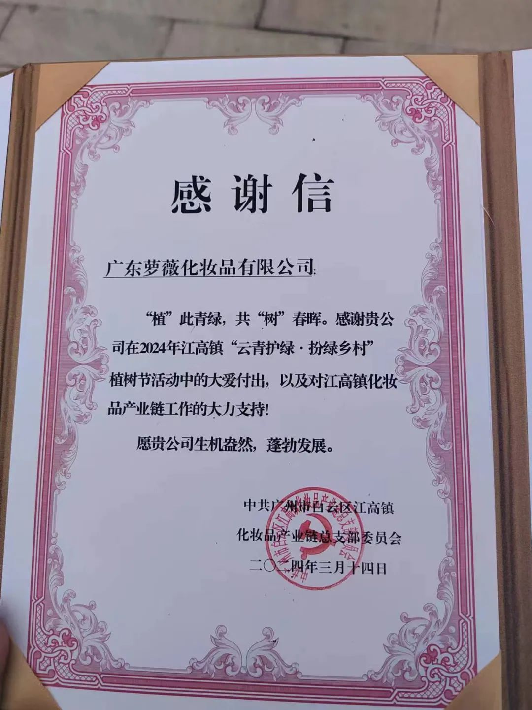 “植”此青绿,共“树”春晖。萝薇参与了这一富有深意的种植活动,共同栽种了代表着“生态、希望、环保”的树苗,用实际行动为广东添一份新绿,种下生机,种下希望,种下对未来美好的祝愿。特此感谢广州市白云区江高镇化妆品产业链总支部委员会的热情邀请与精心筹备!