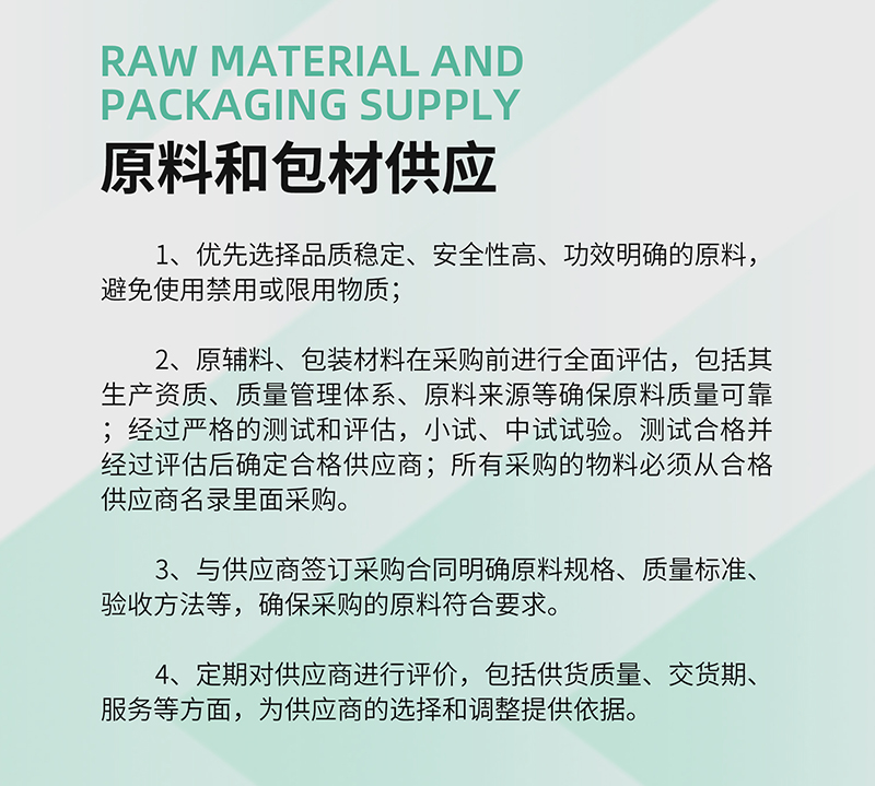 在产品生产的全流程中,原料采购环节对产品质量起着至关重要的奠基作用。严格把控原料关,是确保产品安全、有效且品质稳定的首要前提: