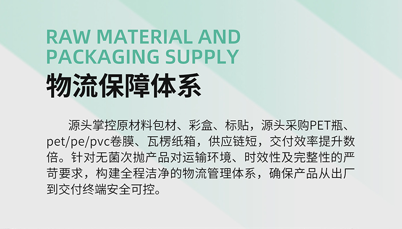 源头掌控原材料包材、彩盒、标贴,源头采购PET瓶、pet/pe/pvc卷膜、瓦楞纸箱,供应链短,交付效率提升数倍。针对无菌次抛产品对运输环境、时效性及完整性的严苛要求,构建全程洁净的物流管理体系,确保产品从出厂到交付终端安全可控