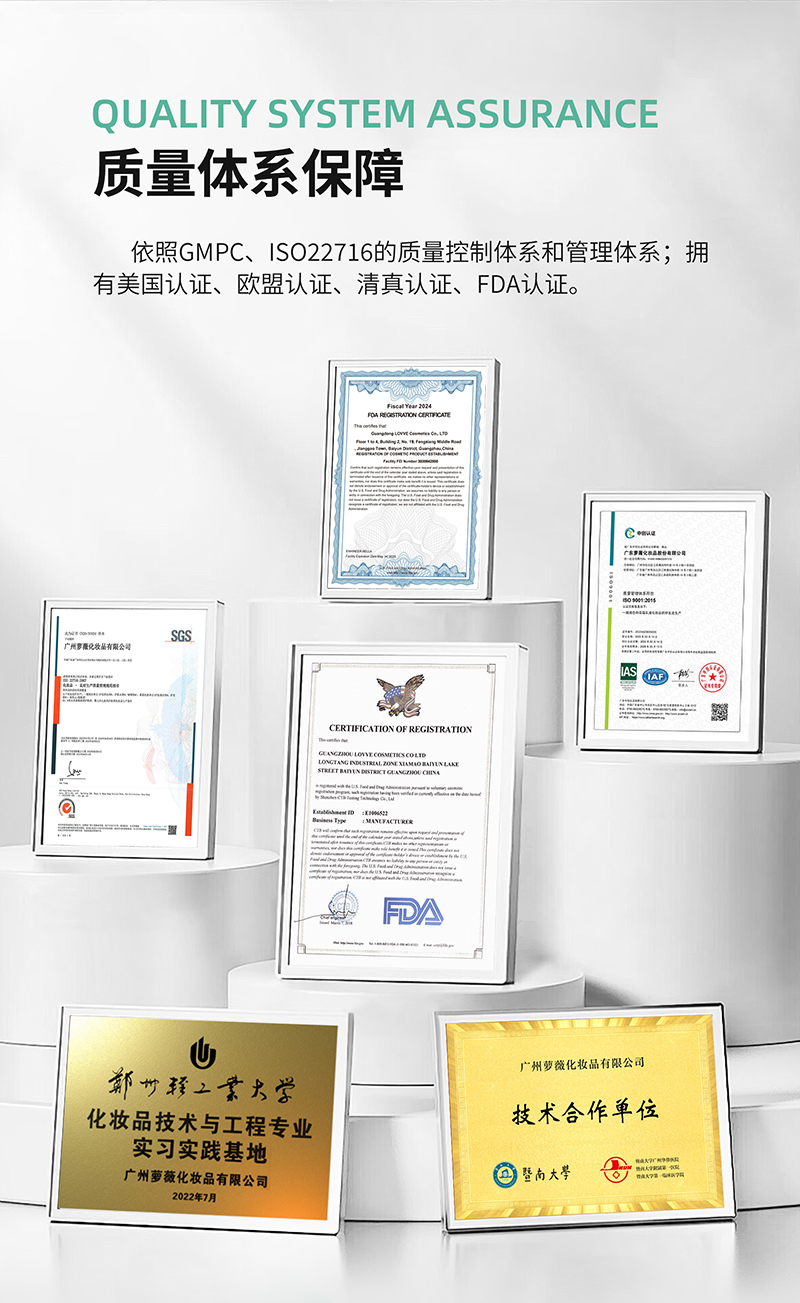 建立严格完整的生产管理体系,按照美国标准GMPC及欧洲标准ISO22716 进行生产。