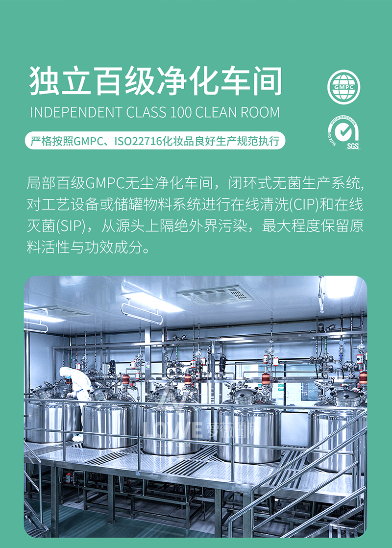 局部百级GMPC无尘净化车间,闭环式无菌生产系统,对工艺设备或储罐物料系统进行在线清洗(CIP)和在线灭菌(SIP),从源头上隔绝外界污染,最大程度保留原料活性与功效成分。
