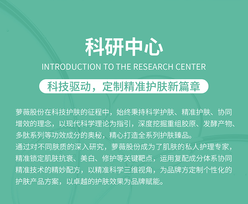 通过对不同肤质的深入研究,萝薇股份成为了肌肤的私人护理专家,精准锁定肌肤抗衰、美白、修护等关键靶点,运用复配成分体系协同精准技术的精妙配方,以精准科学三维视角,为品牌方定制个性化的护肤产品方案,以卓越的护肤效果为品牌赋能。
