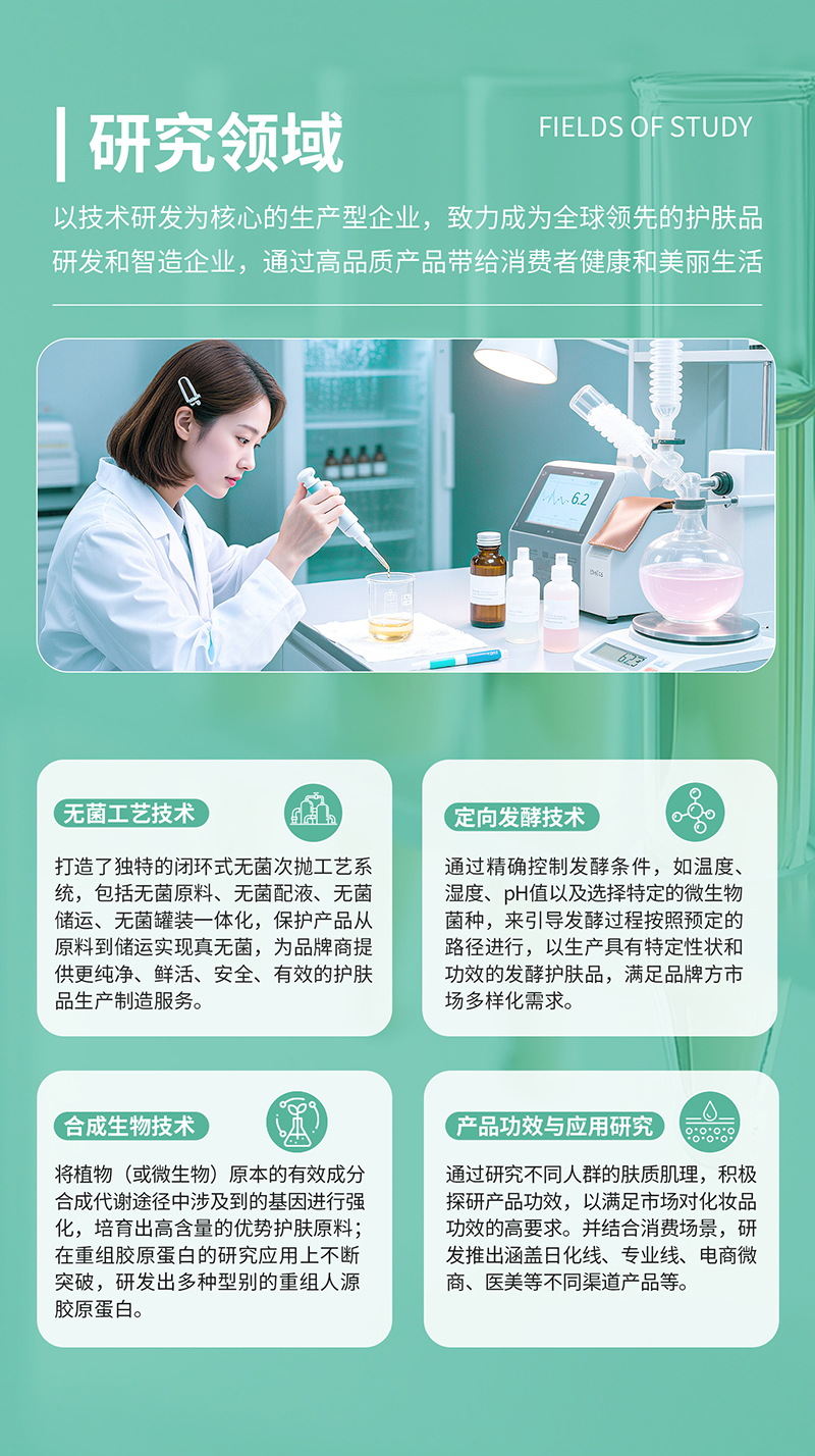 通过精确控制发酵条件,如温度、湿度、pH值以及选择特定的微生物菌种,来引导发酵过程按照预定的路径进行,以生产具有特定性状和功效的发酵护肤品,满足品牌方市场多样化需求。